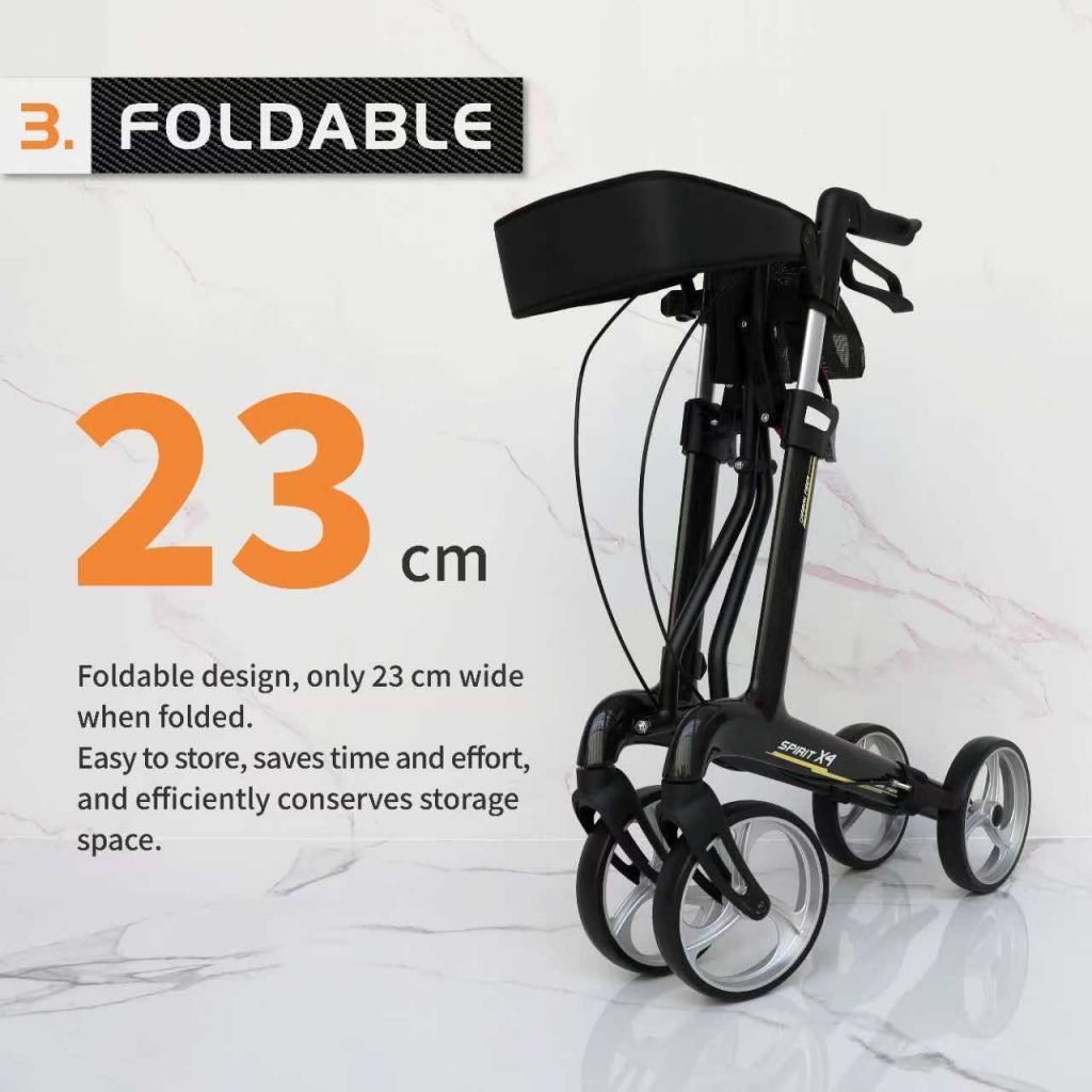 The SPIRIT X4 is constructed from carbon fiber, making it exceptionally lightweight, yet durable. Its foldable design ensures convenience and portability, while advanced safety features provide peace of mind during every use. The SPIRIT X4 is more than just a mobility aid—it’s your key to a more active and independent lifestyle.